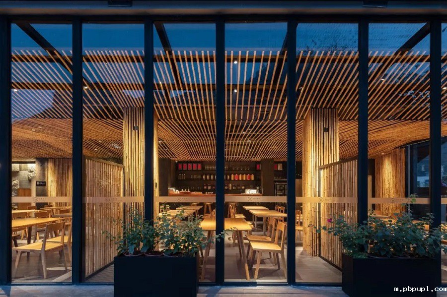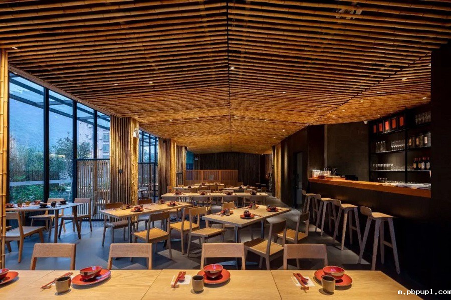 餐厅的天花由单根竹子按照一定序列排成谷峰型的结构,空间变得丰富而富有韵律,为建筑与自然的融合达成极好的情感链接。