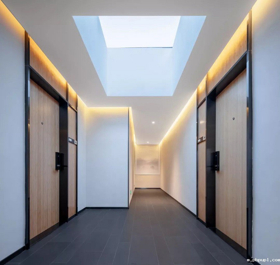 餐厅与大堂的衔接口也是通往客房的通道,乘电梯而上,每一层过道的成色格调都延续了首层空间的温暖竹木色,设计师将黄花的山水制成布画置于通道的尽头,尽显淡泊素雅。