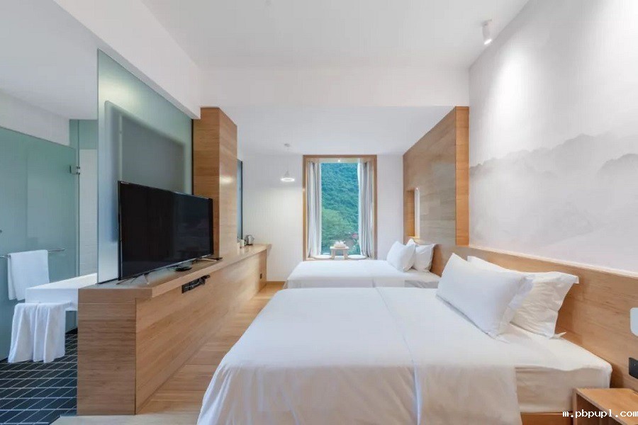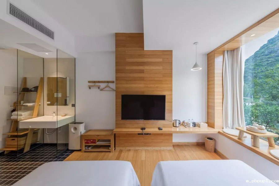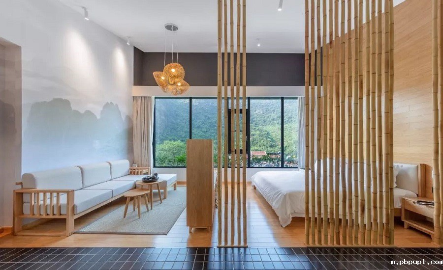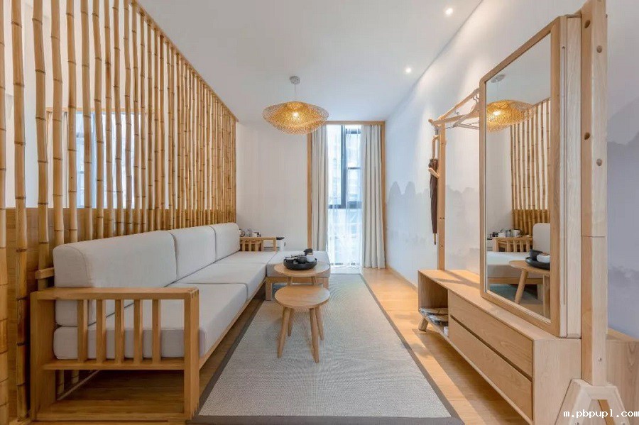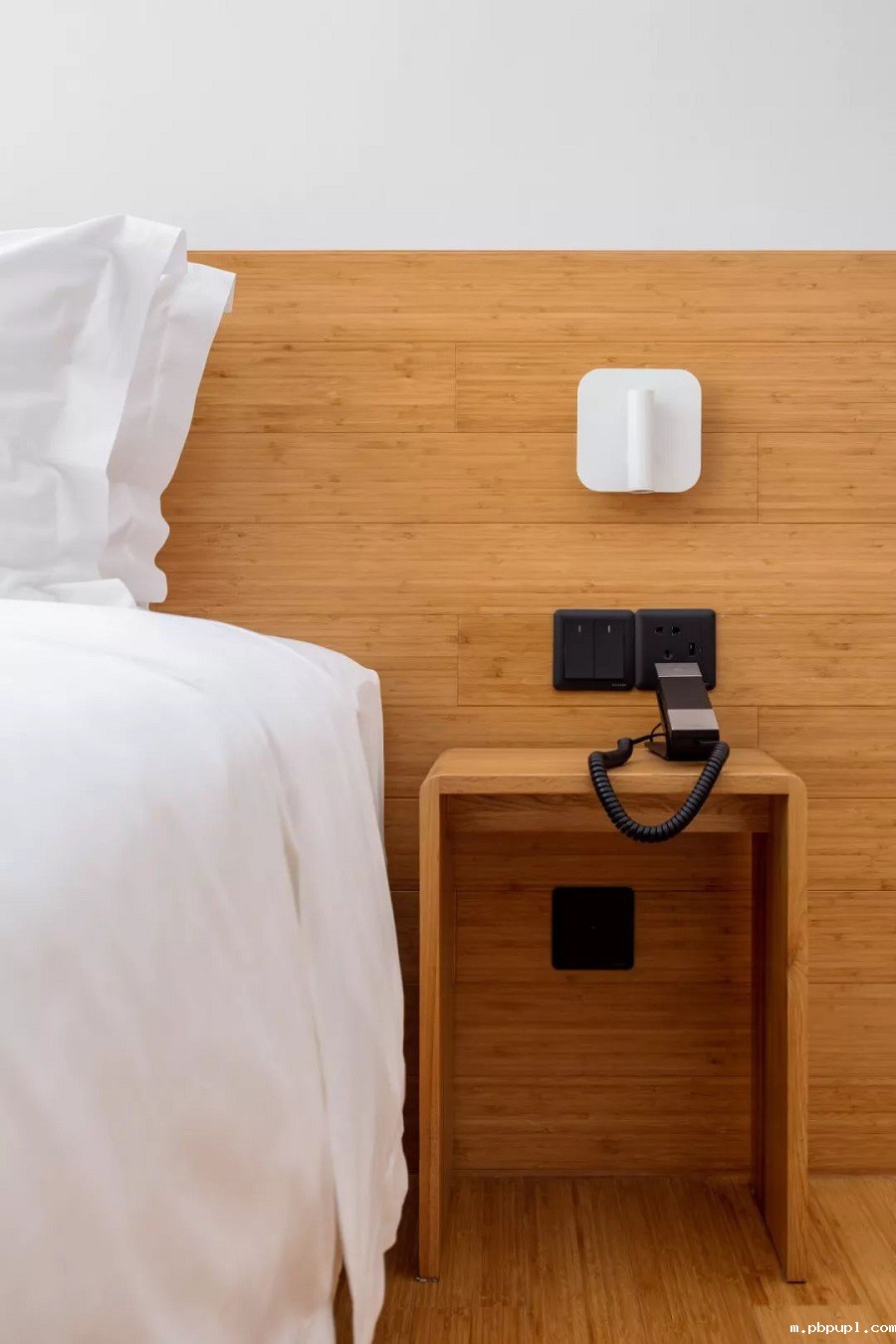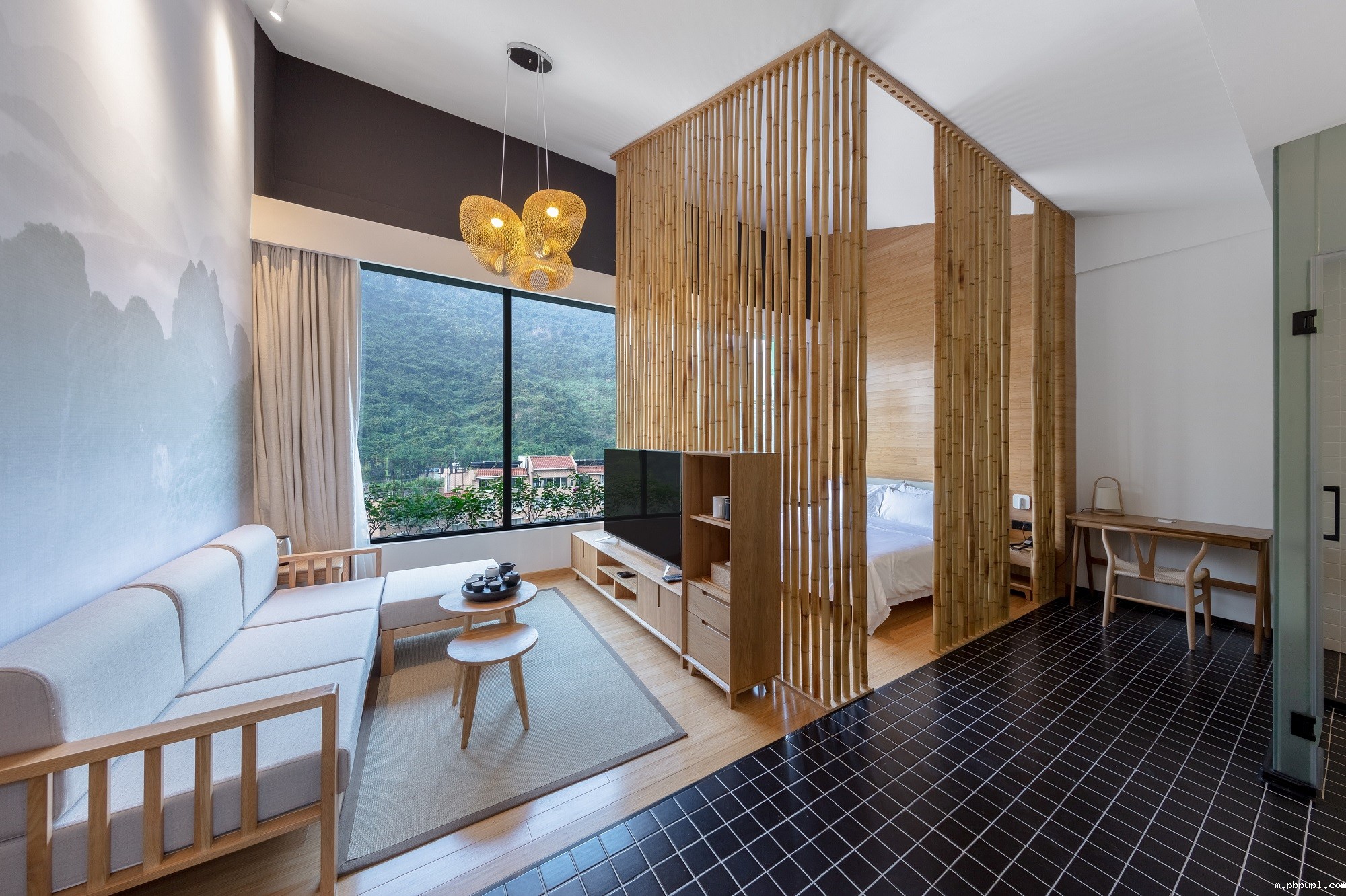 酒店客房设计崇尚至简原则,尽可能地为空间留白,给人以最丰富的想象空间。装饰材料亦以无污染、自由释放负离子的竹材为主,从地板到墙面无不呈现简约有温度的空间氛围。