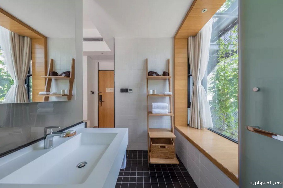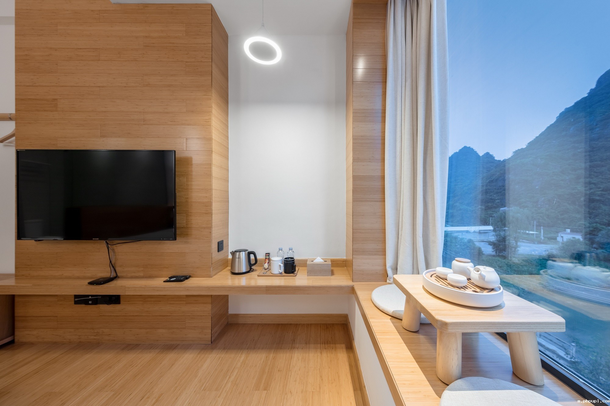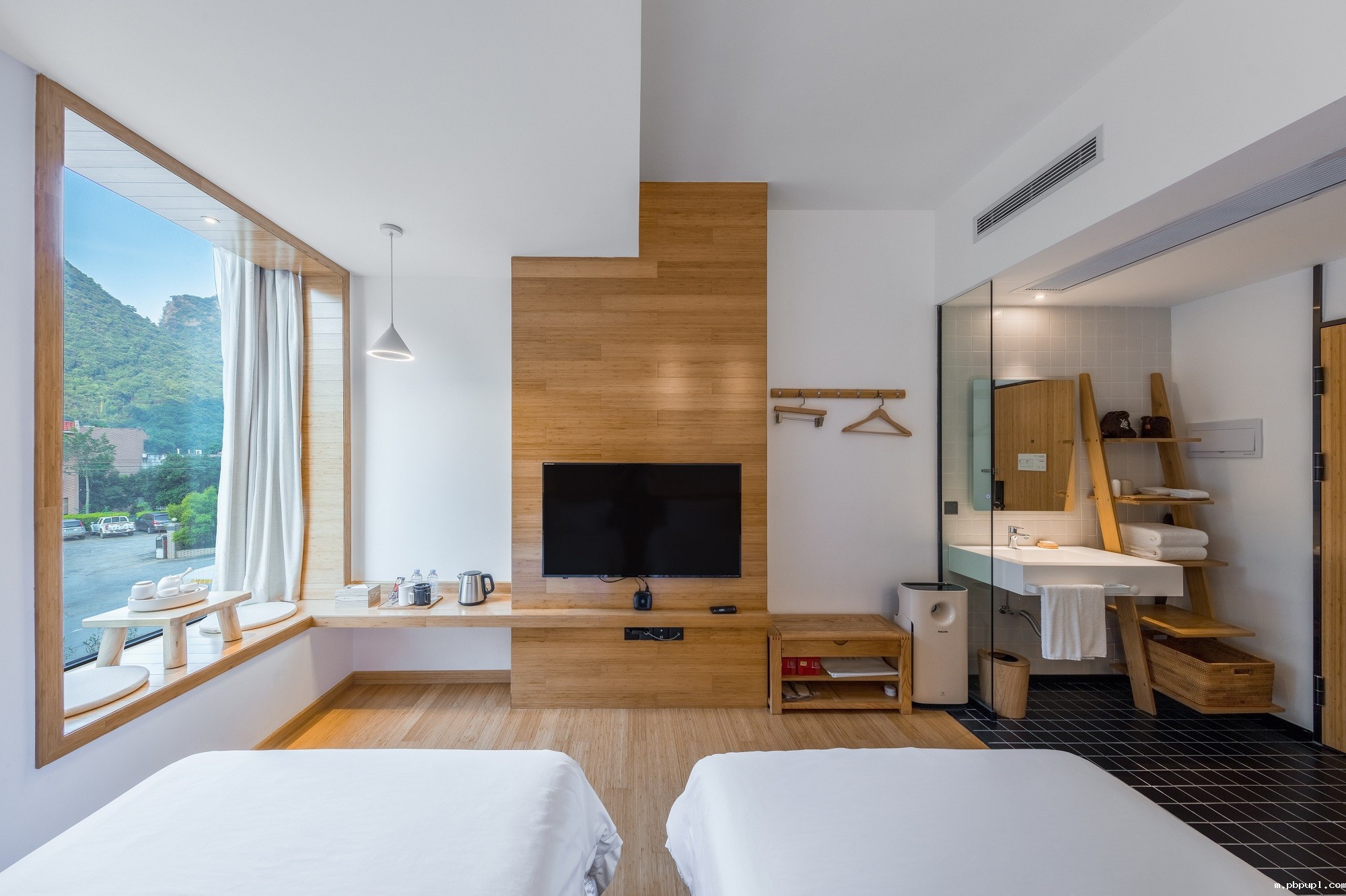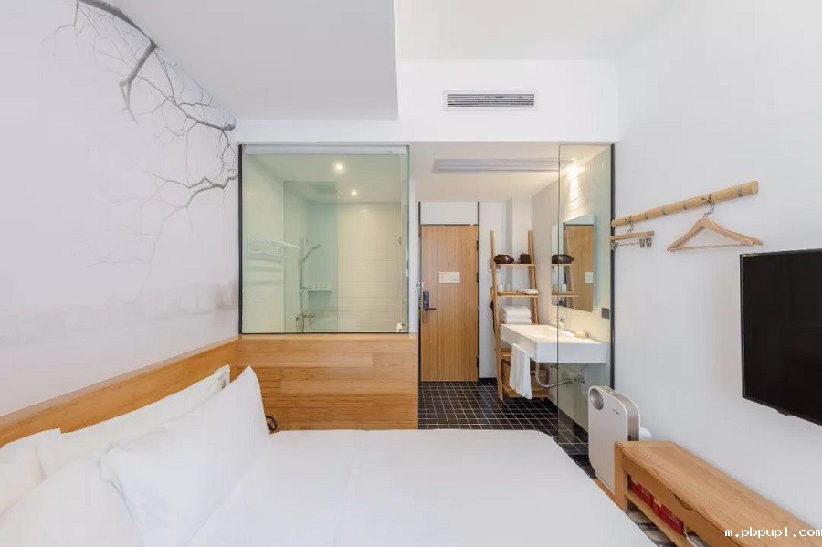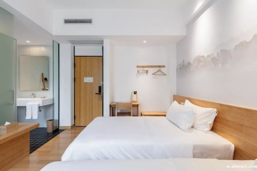 酒店客房设计崇尚至简原则,尽可能地为空间留白,给人以最丰富的想象空间。装饰材料亦以无污染、自由释放负离子的竹材为主,从地板到墙面无不呈现简约有温度的空间氛围。