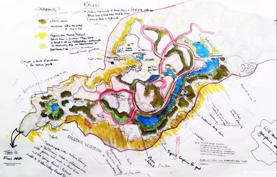 团队围绕公共绿地的景观规划,从大地景观系统的视角推敲每一个建设用地的可利用景观资源,在更宽广的尺度上,结合多方位综合平衡的思考,对原有的城市规划设计进行优化。
