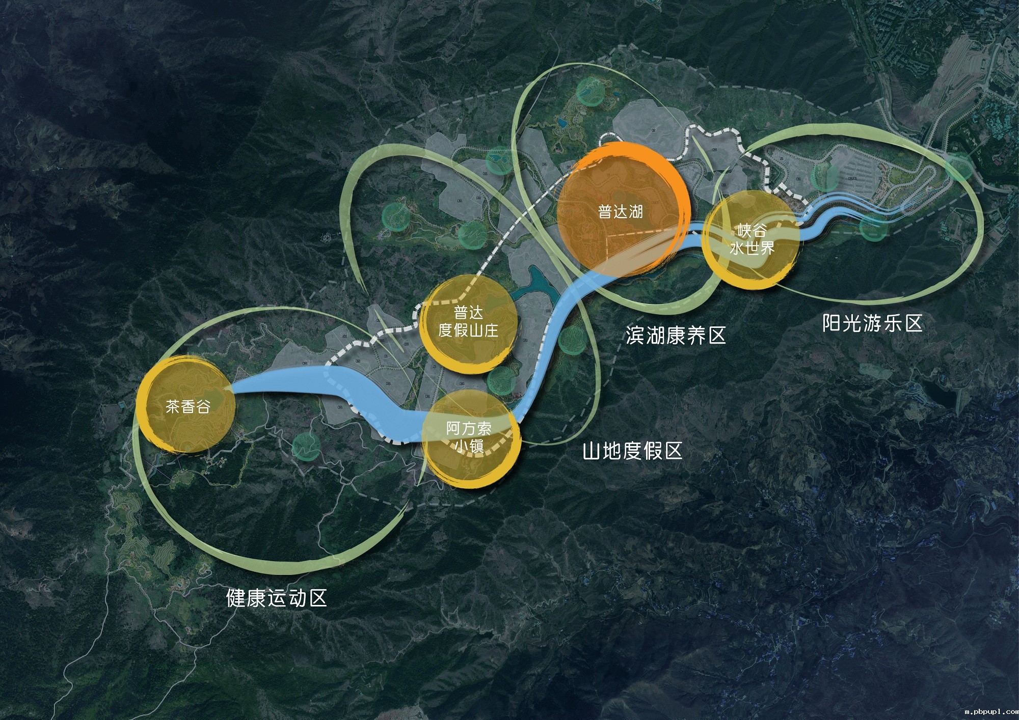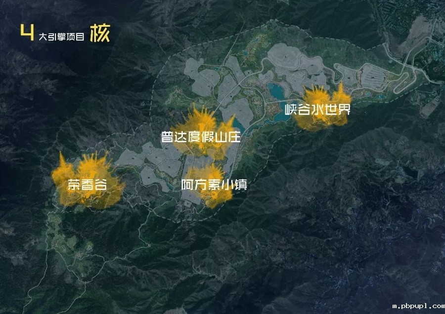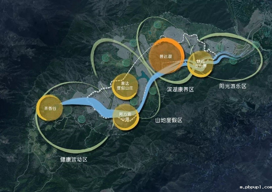 以峡谷游线为主的旅游轴线,将阳光游乐区,滨湖康养区,山地度假区,健康运动区四大主题板块有机串联。
