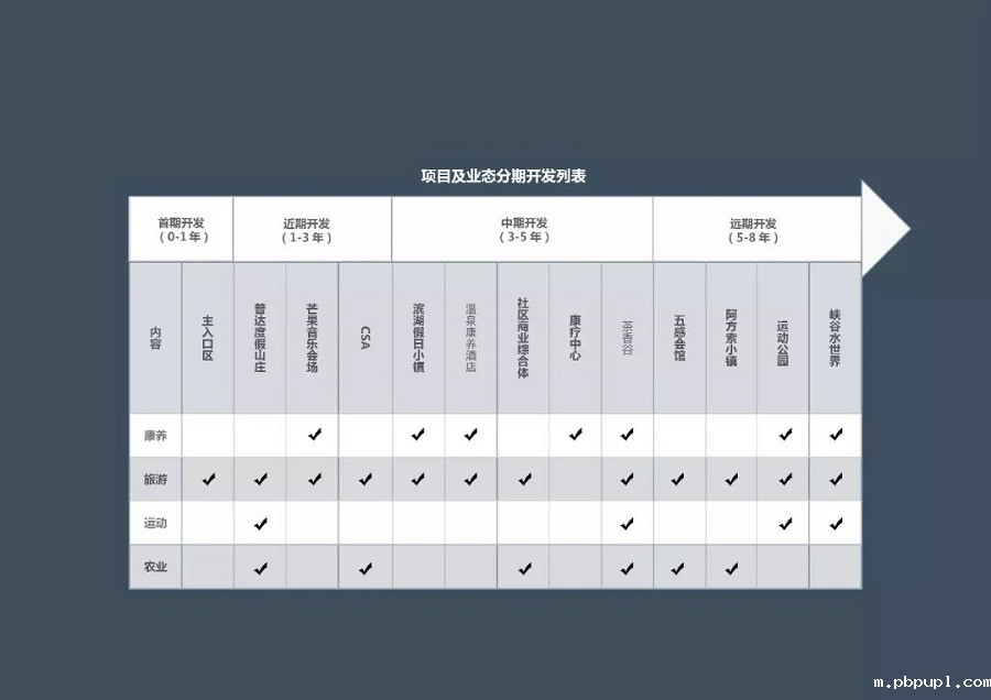项目立足长远的游线策划与可达性分析,从首、近、中、远四期分步实施策划和运营的发力点分析,策划各个阶段的亮点项目,用以点带区的手法,优先带动旅游项目的发展成熟,并从覆盖区域与游线组织上,整合覆盖区域的线路景观、景点、物业开发,从点到线,形成片区开发,以确保项目在开发过程中的每个阶段,都能形成一个完整的、自成体系的旅游目的地。