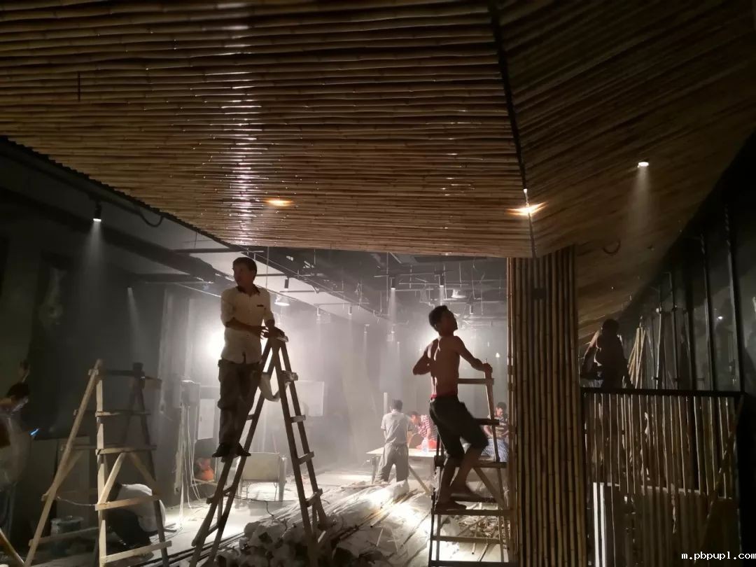 另外,竹子的安装与固定方式也非常值得考究,在兼顾美观、耐用的前提下,如何让长达4余米的原竹稳当的立起来,竹子与灯光照明的关系如何处理?由于首层的竹天花面积很大,所以我们采用了峰谷型的组合,在间距上也做出变化,这样首层空间变得丰富,竹子朴实而具有灵性的质感也得到体现。
