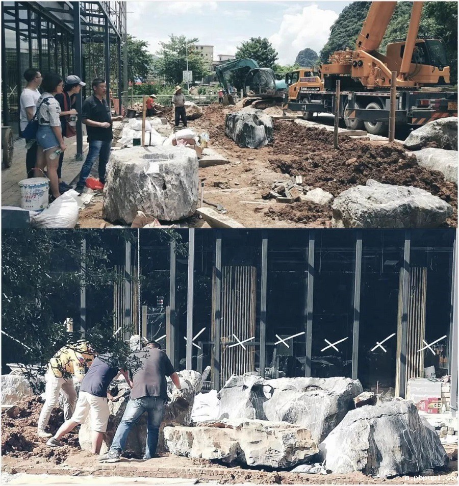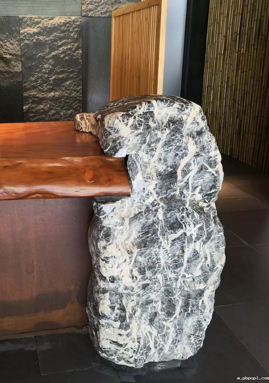 酒店前台由一块重2吨的实木板与一块重1吨多的英石(一种英德市特有的石材)组成。但当我们完成首次拼装后,却发现木板的收口并不理想。于是,我们决定即刻出发上山寻找石材进行优化。