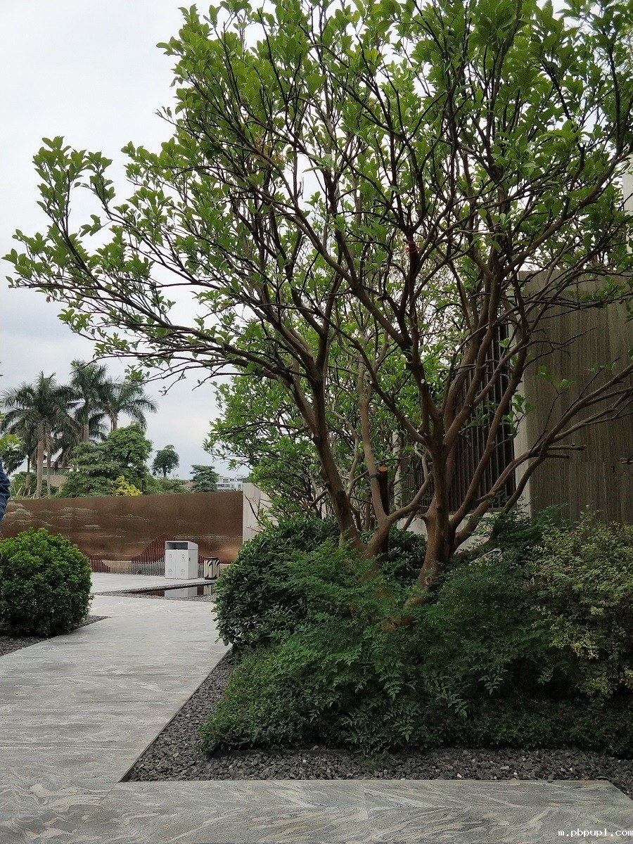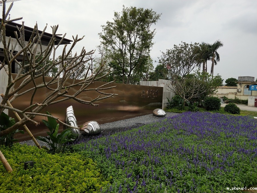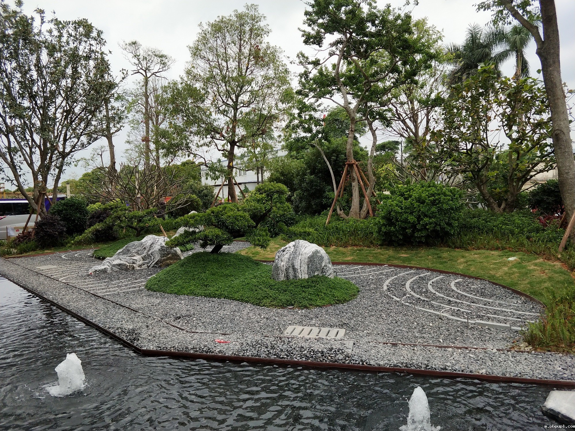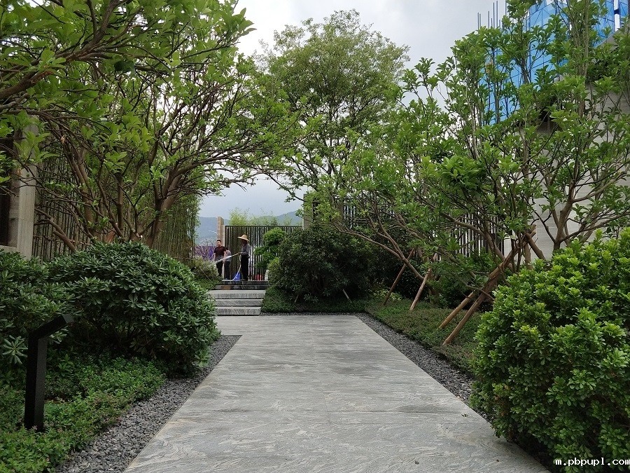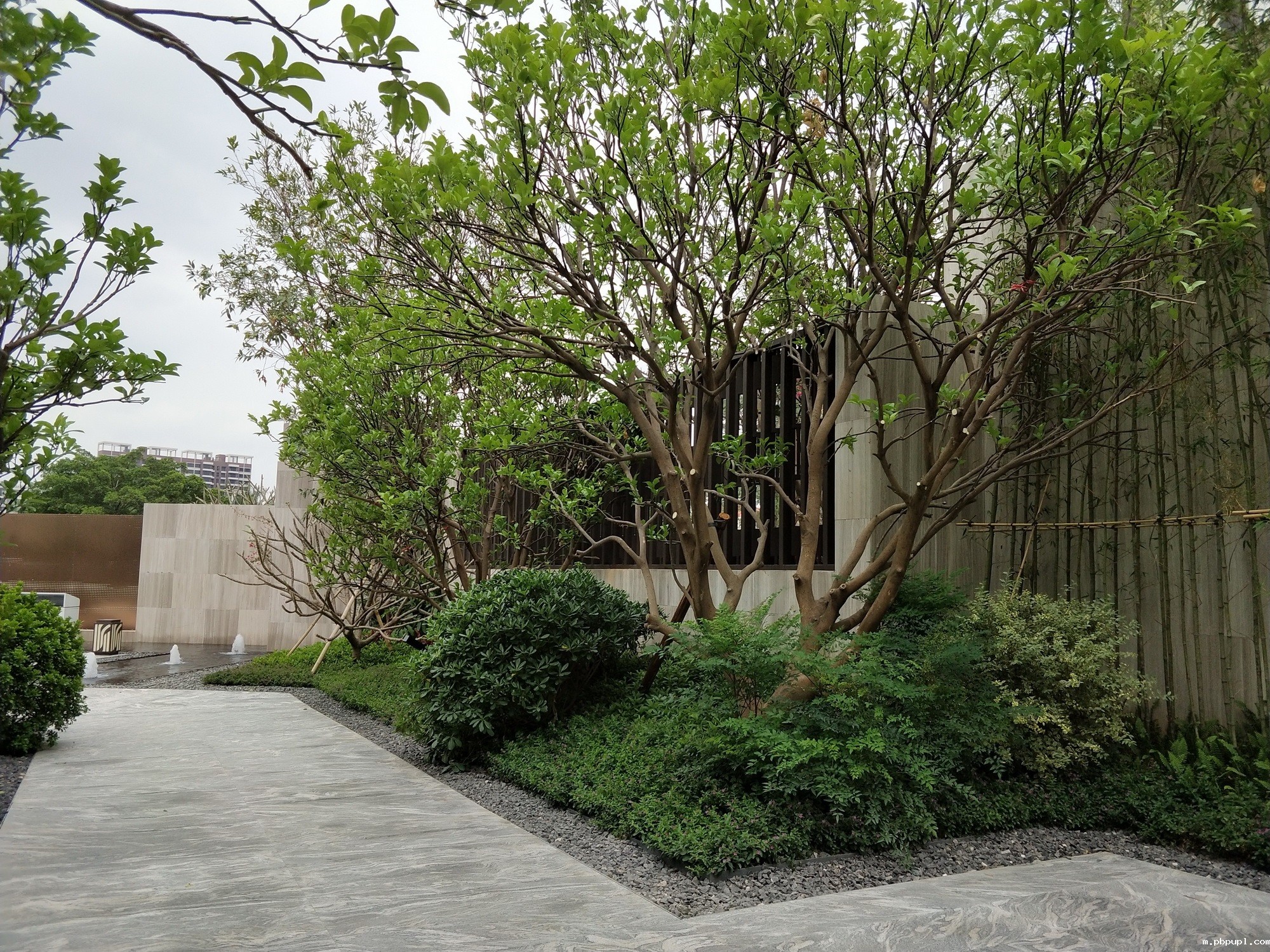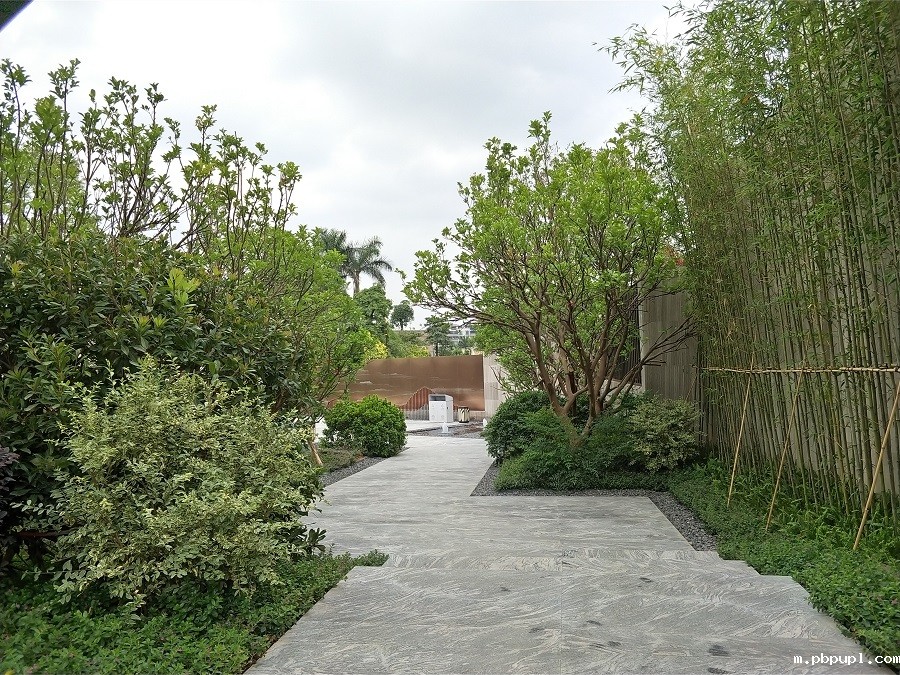 项目为新中式风格,主要施工内容有地面石材铺装、景墙、水景、绿化配置、铁艺门廊、水电灯具等。