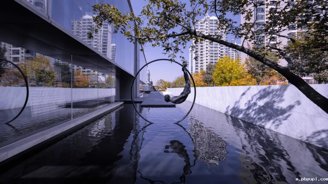 澄澈浅淡的水潭中,水底纹理纤毫毕现,水面映着天空的倒影,一抹湛蓝,是天色,是水色,跃动的人型铜塑出现在视野尽头,夸张的肢体语言指引着前进的方向。