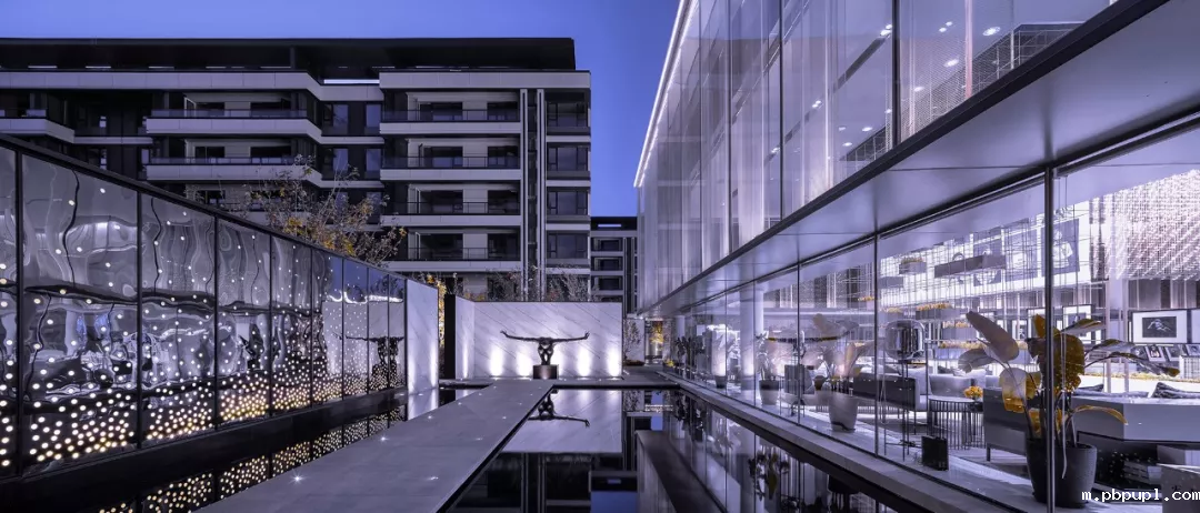 镜面不锈钢景墙增加了后场空间的开阔感,在白天折射不同的光影效果,渲染出流动的光影肌理,夜幕降临时,玻璃墙星光闪烁,荧荧光芒倒映在镜面水景上,如银河般倾泻而出,如梦似幻,与隔岸的巨大玻璃幕墙交相辉映。