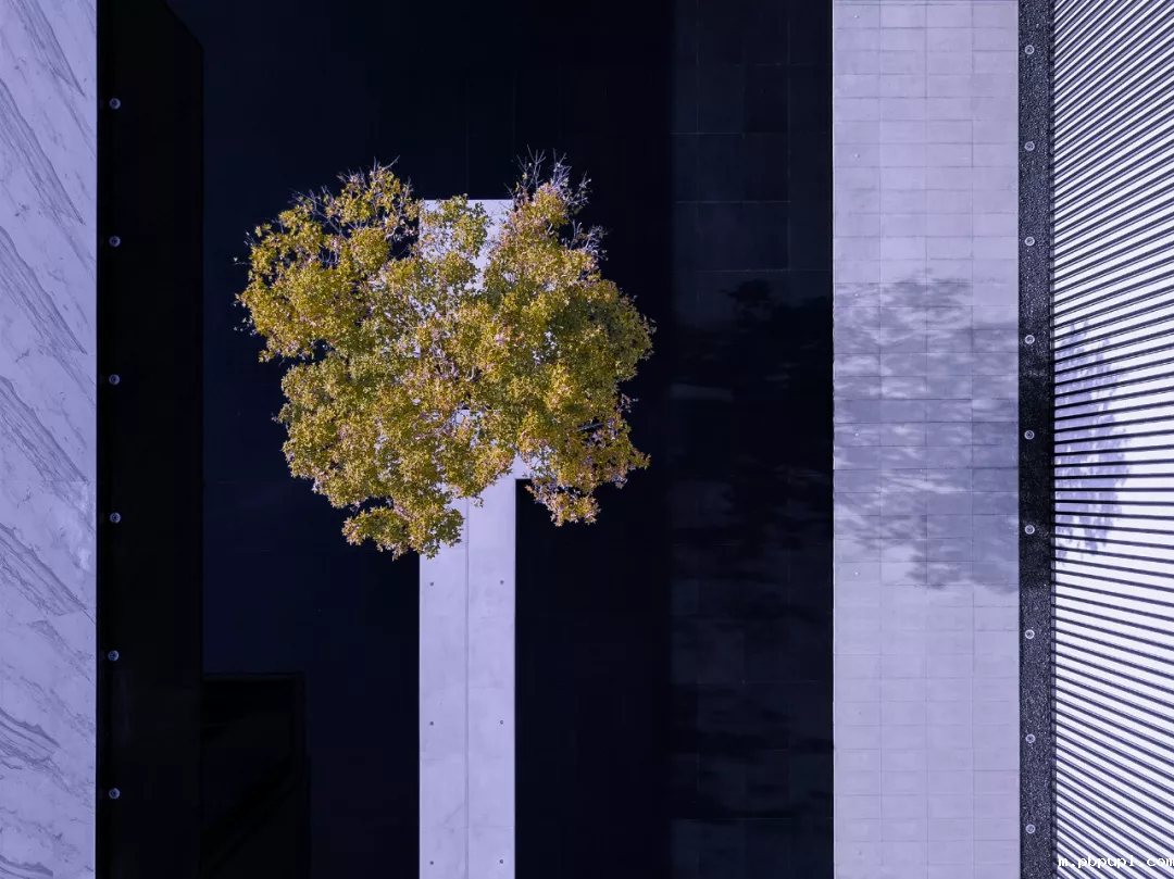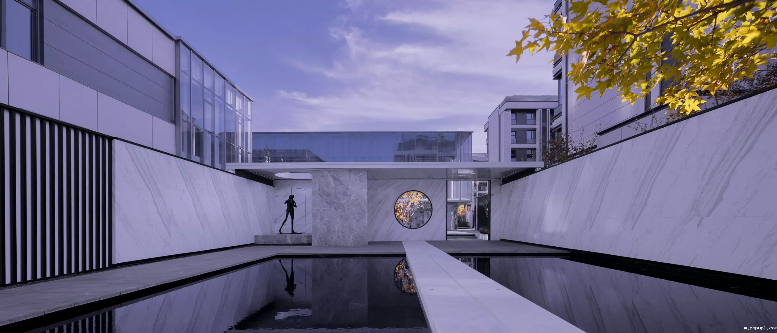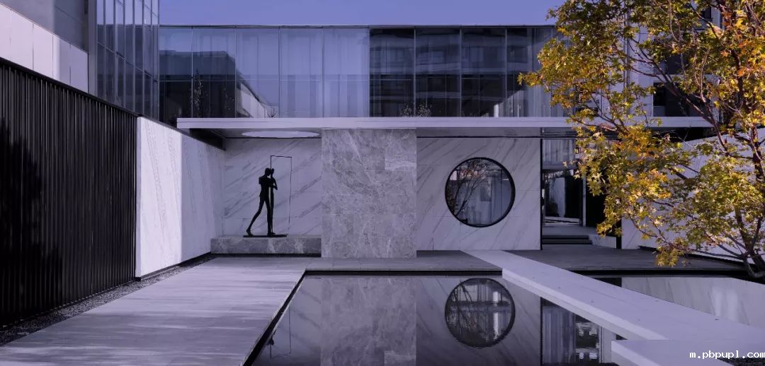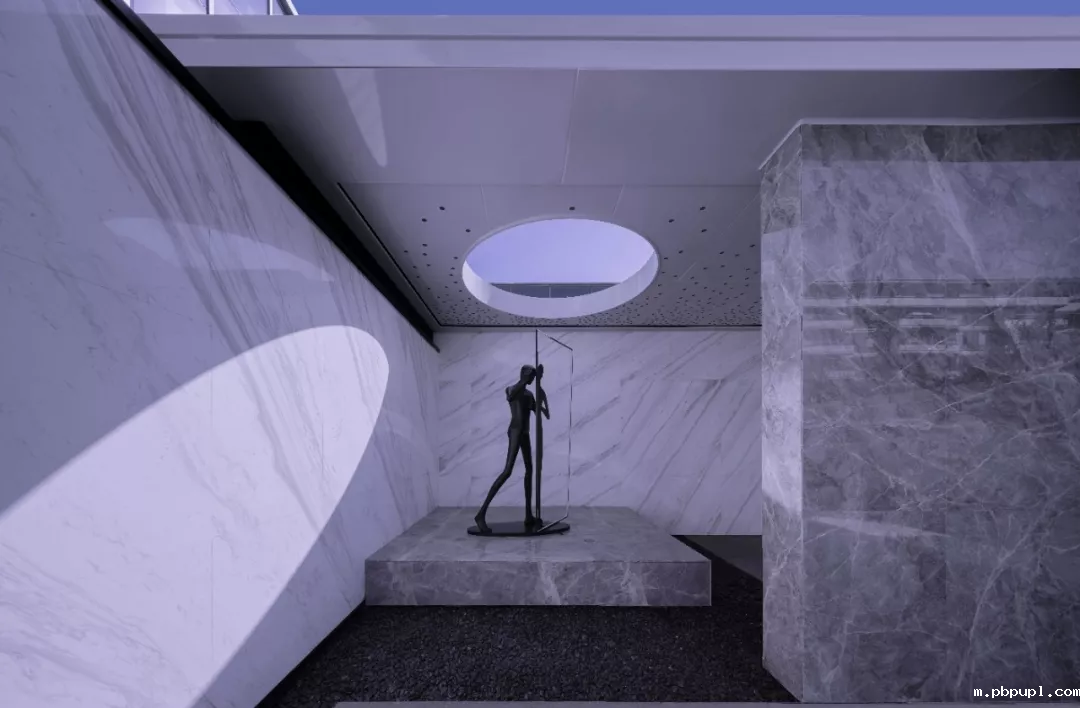 白色大理石砌成的艺术短廊,既作小型会客厅,亦为自然艺术空间,风,从景墙上的圆窗与顶上的天窗倏忽而过,吹起行人的衣角,卷起飘落的黄叶,仿佛自然在耳边呢喃。