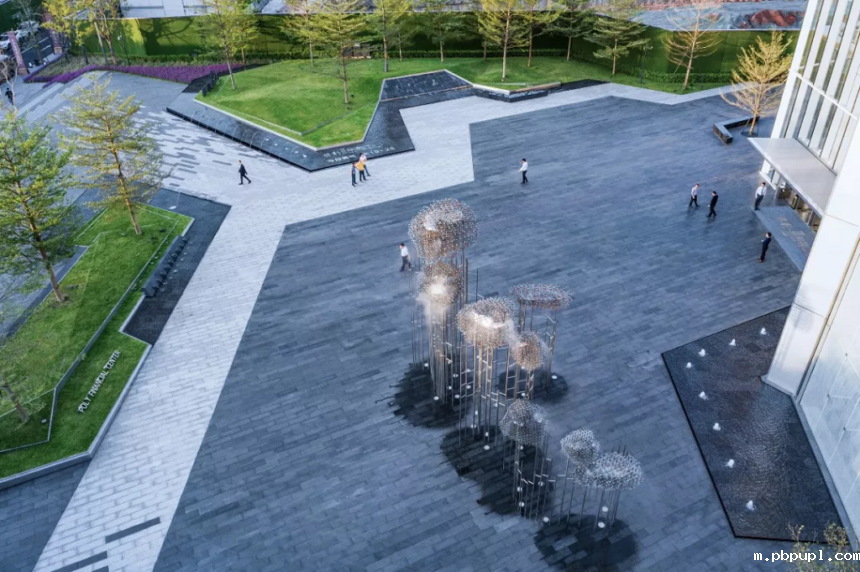 层级打造落差的水景与绿植相辅相成,犹如山涧瀑流一条界破青山色,营造一种天然舒适的场景。活泼奔腾的瀑流,流向的是围绕整个中心广场的曲线水景,流淌成淙淙清水的景致。用心观望水景仿如明镜,青空云彩统统映于水中。清风拂过水面涟漪起,水中云也随之优雅变幻。“云端流飞瀑,水底见青山。”