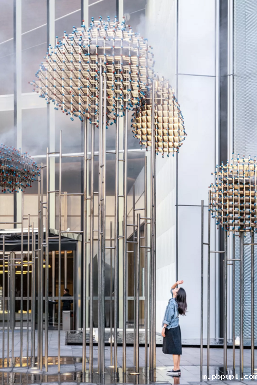 其打破了想象中云雾软绵柔和的虚无感,以硬朗的多重线条交叉层叠出大小不一、形状各异的云朵,但从云朵里释放出的缥缈梦幻的水雾又将云朵的特色展露无遗,更为铿锵有力的是从云端而降的飞瀑,虚空落泉千仞直,采用金属材质打造飞瀑直流而下的率直爽朗。