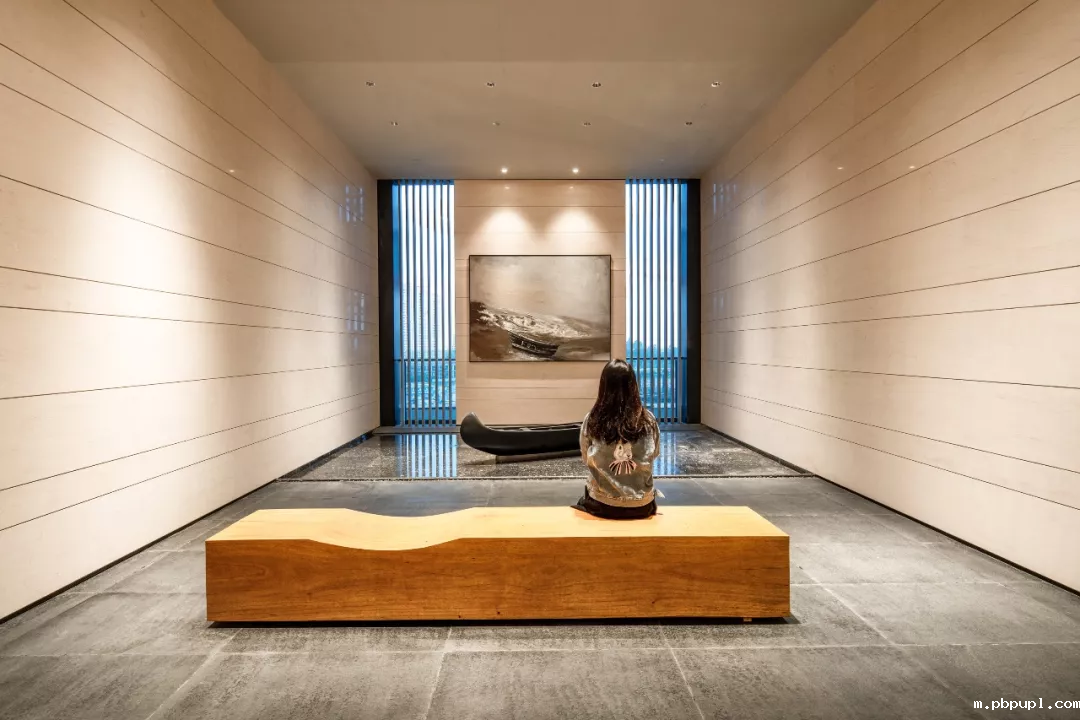 场所里的水景意境以光面的静止大理石艺术装置承载,在池中戏水的少女又为整个装置带来活力,有一种动静皆相宜的平衡。