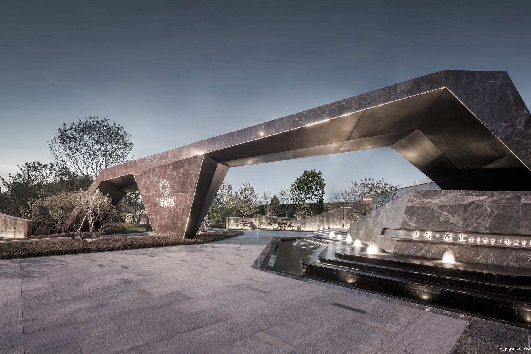 入口远山构架是项目第一个对外展示界面。设计师采用爱马仕灰大理石深色调来营造门楼体量感,构架斜面和顶面设置了星星点灯,将远山之姿抽象简化,仿照自然山体虚与实、光与影交错的特点,营造了人在山中行,泉在洞中流的现代山水雅庭。